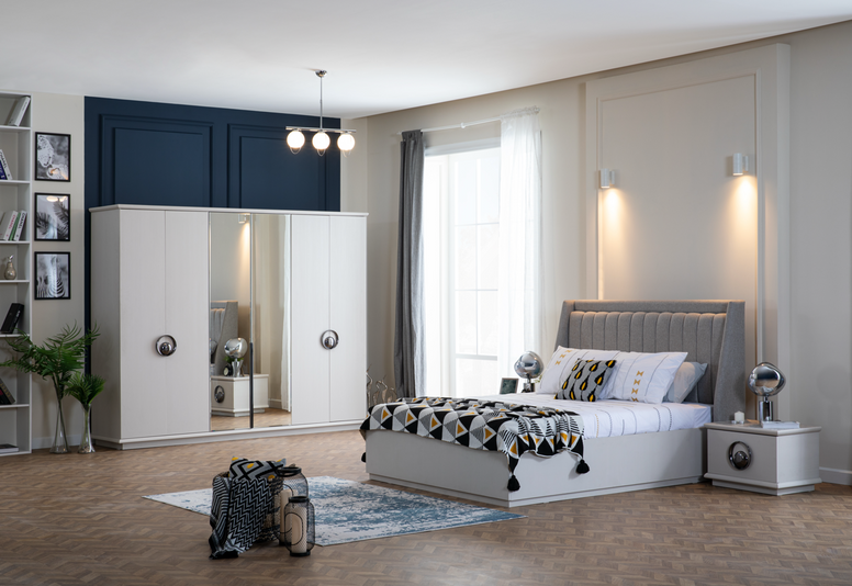 • Гардероби с акценти – Изберете от гардероби с 6 врати, 4 врати или плъзгащи се гардероби, всички с вградени огледала за увеличаване на светлината и пространството.