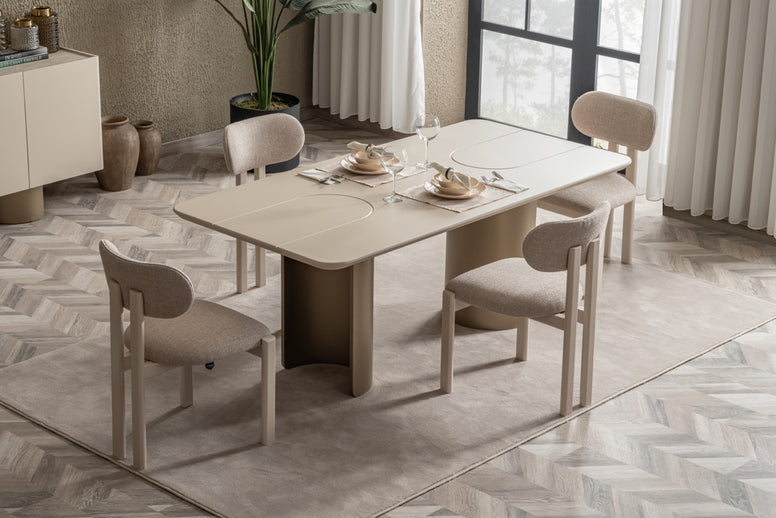 Комплектът за хранене Alanya превръща вашето трапезарно пространство в модерно убежище, където функционалността среща изтънчеността. Неговите меки цветове, уютните места за сядане и многофункционалното място за съхранение го правят идеален както за ежедневни хранения, така и за специални събирания.