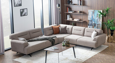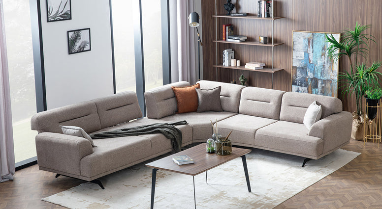 Това е просторен и функционален L-образен секционен диван , проектиран за модерни дневни. Със своите широки места за сядане, регулируема дълбочина на облегалката и мека текстурирана материя, той съчетава комфорт и елегантност.
