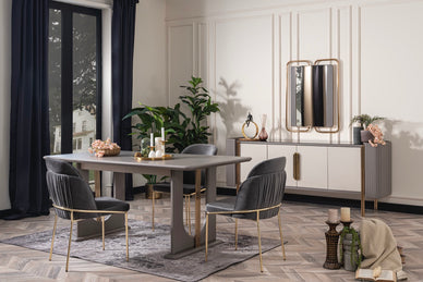 • Премиум трапезарна маса: Правоъгълен дизайн с меки ръбове, включващ двойни пиедестали, подчертани от златни метални акценти за нотка лукс.