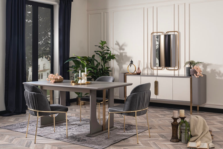 • Удобни столове за хранене: Тапицирани с мека кадифена материя с плисирани детайли на облегалката и метални крака със златно покритие , съчетаващи комфорт с елегантност.