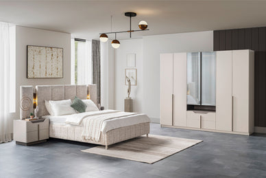 С просторен гардероб с огледални детайли, тапицирано легло за съхранение, предлагащо интелигентна организация, елегантни нощни шкафчета със съвременни дръжки и изискан скрин с огледало, всяка мебел е проектирана едновременно за красота и използваемост. Премиум покритията и фините светлинни акценти засилват луксозното усещане, като същевременно поддържат уютна и приветлива атмосфера.