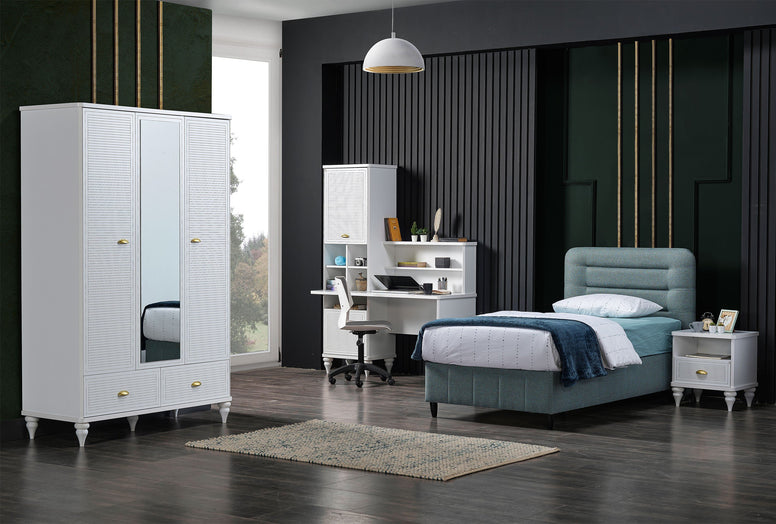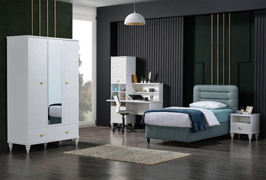 Открийте перфектното обзавеждане за детската стая с колекцията Janti. Съвременен дизайн с минималистични линии, включващ удобно легло , компактно нощно шкафче с практични чекмеджета,трикрилен гардероб,Бюро и функциона тоалетка с огледало с обилно място за съхранение.