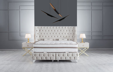 Комплектът LAMORE съчетава елегантност и функционалност с луксозния си капитониран дизайн и модерни линии. Високата табла с копчета създава изискана атмосфера, а кадифената текстура добавя меко и стилно докосване.