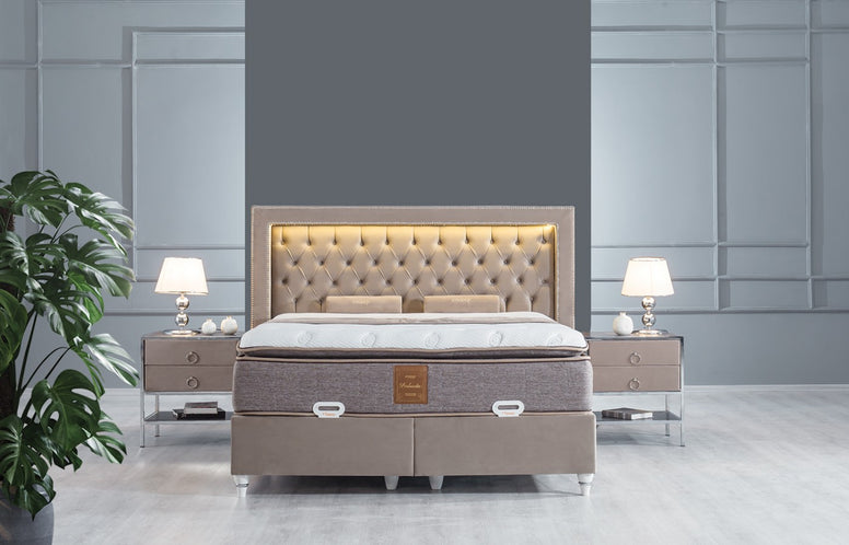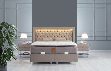 LIGHT Легло + LIGHT Матрак съчетава изискана елегантност с практичност, предлагайки модерно решение както за комфорт, така и за съхранение. Проектиран с ватирана, осветена табла и висококачествена материя, той внася мека и луксозна атмосфера във вашата спалня.