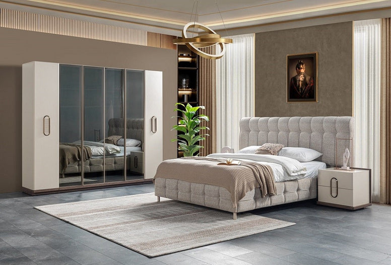 BALOS спален комплект съчетава елегантен дизайн с практична функционалност, създавайки уютна и стилна атмосфера за вашето жилищно пространство. С меки неутрални тонове, висококачествена тапицерия и изискани детайли, тази колекция внася вечен комфорт и изтънченост във вашата спалня.