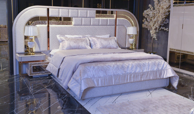 Спален комплект TESLA PLATIN  е идеален за тези, които искат да създадат спалня, която е луксозна, модерна и вечна . Със своите бляскави покрития и функционално място за съхранение, той съчетава красота с практичност, издигайки ежедневието ви на по-високо ниво.