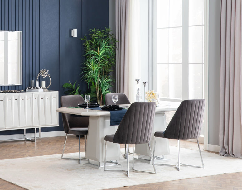 • Трапезни столове : Тапицирани с мека материя с вертикални шевове и поддържани от модерни хромирани крака, предлагащи едновременно комфорт и съвременен стил.