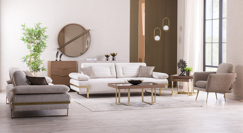 Комплектът дивани Pablo съчетава елегантност, комфорт и функционалност със своя модерен дизайн и иновативни детайли. Изработен от мека, издръжлива материя и подчертан от впечатляващи златисти метални крака, Pablo добавя луксозен щрих към всяко жилищно пространство.
