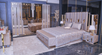 Спалният комплект VALENCIA съчетава модерна елегантност и луксозни детайли, създавайки изискана и стилна атмосфера. Със своята смела геометрична табла, мека тапицерия, златни акценти и огледални покрития, тази колекция е предназначена за тези, които искат едновременно комфорт и изтънченост в спалнята си.